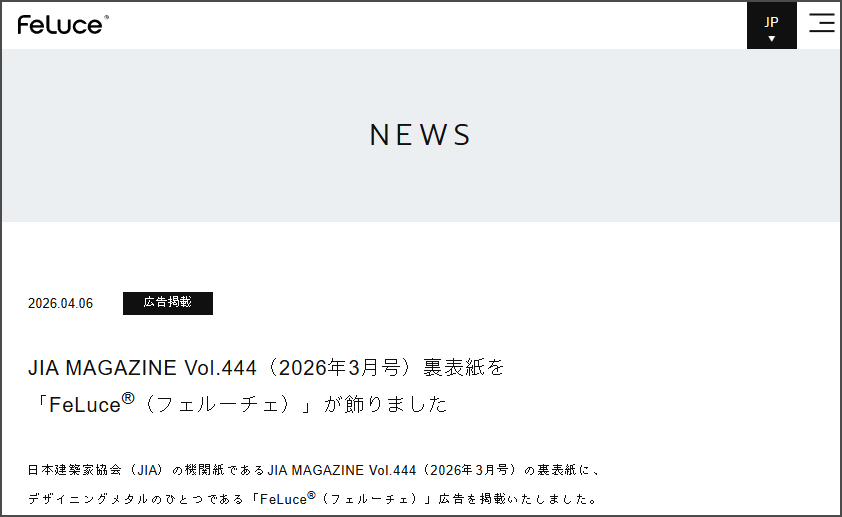 掲載内容は、建築専門誌 「JIA MAGAZINE Vol.444」裏表紙広告に関するもので、「パネラマ FeLuce」が紹介されています。